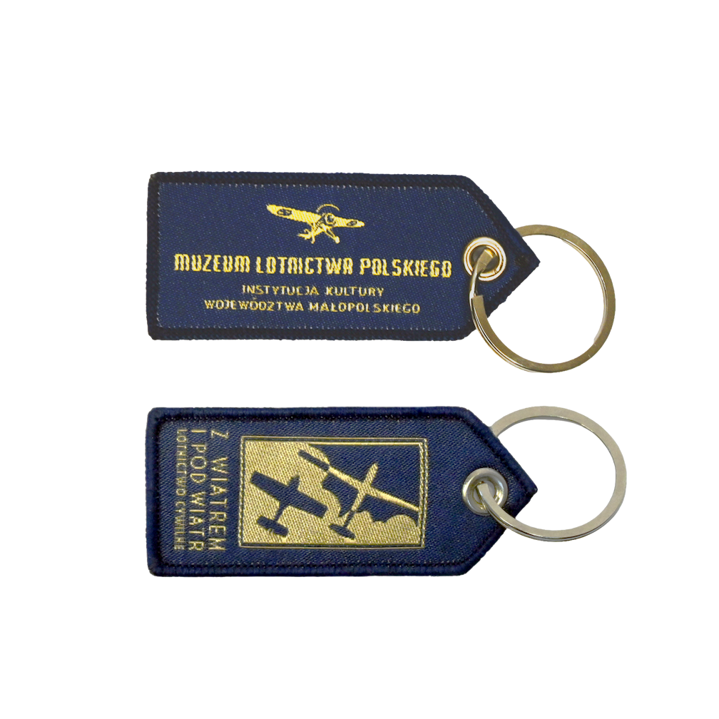 Tekstylny brelok z Muzeum Lotnictwa Polskiego z napisem Z WIATREM I POD WIATR LOTNICTWO CYWILNE